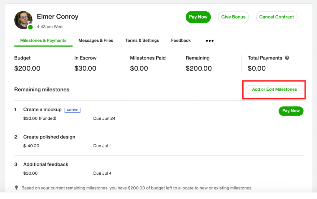 Below is a demonstration of how Upwork — the world’s largest online work marketplace — manages milestone payments